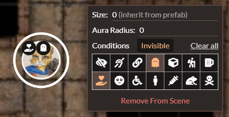 Drag tokens into the scene to move and finetune them individually. A set of condition icons can be applied to keep track of a creature's state.